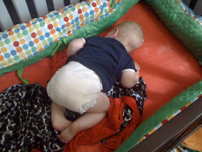 Over Memorial weekend (end of May) he decided he wanted to start rolling. That night was not so much fun. He would roll over in bed, sit up and then not know what to do except cry. He figured it all out and now sleeps happily on his stomach. Which is actually cute.